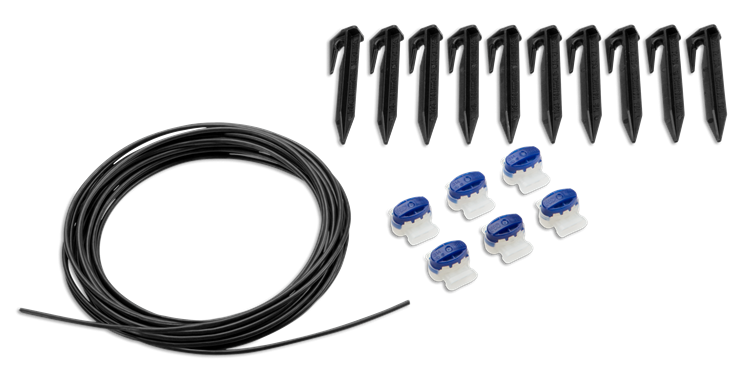 Sættet indeholder: 5 meter afgrænsningskabel, 6 kabelsamlere og 10 pløkker.