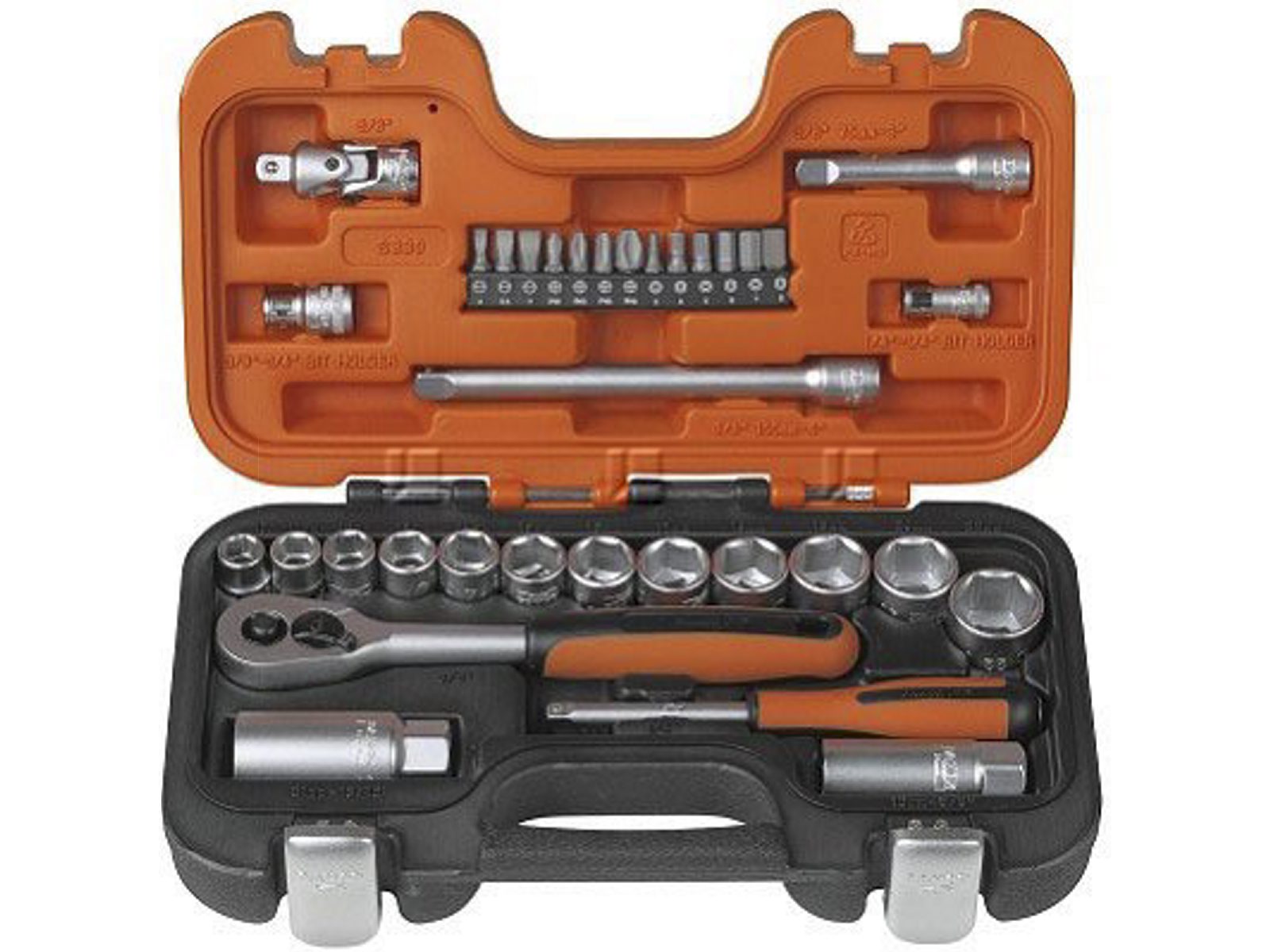 Bahco 3/8' topnøglesæt, 6-kantet med 33 dele Type S330· Indhold: 12 stk. Dynamic Drive toppe: 10 - 11 - 12 - 13 - 14 - 15 - 16 - 17 - 18 - 19 - 20 & 22 mm 2 stk. 3/8' forlænger: 75 - 150 mm 1 stk. 3/8' kardanled 1 stk. 3/8'-1/4' mellemstykke til bits 2 stk. 3/8' tændrørstoppe: 16 mm (5/8') - 21 mm (13/16') 1 stk. 1/4' vridhåndtag 1 stk. 1/4' - 1/4' mellemstykke til bits 3 stk. 1/4' bits, lige kærv: 4 - 5,5 - 7 mm 3 stk. 1/4' bits, Philips: 1 - 2 - 3 6 stk. 1/4' bits, Unbrako: 3 - 4 - 5 - 6 - 7 - 8 1 stk. 3/8' skralde med 54 tænder Leveres i slagfast plastkuffert: 340x260x75 mm