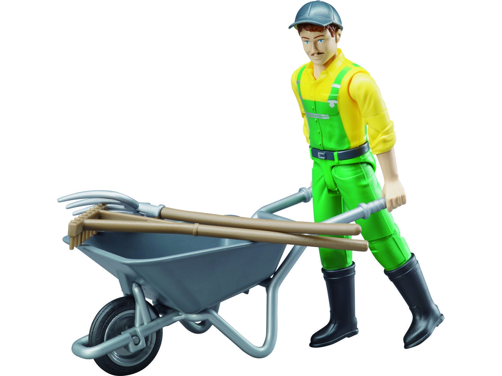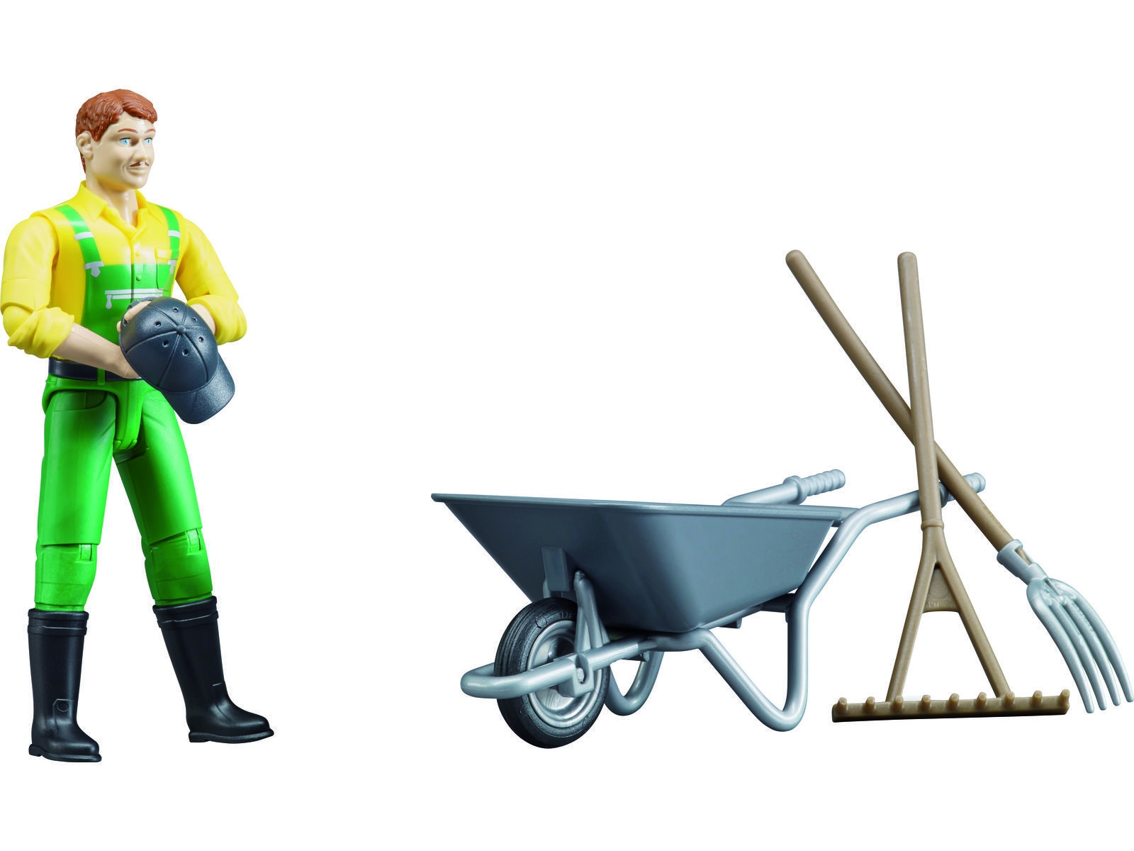 tilbehøret består af: trillebør, rive, greb og kasket.