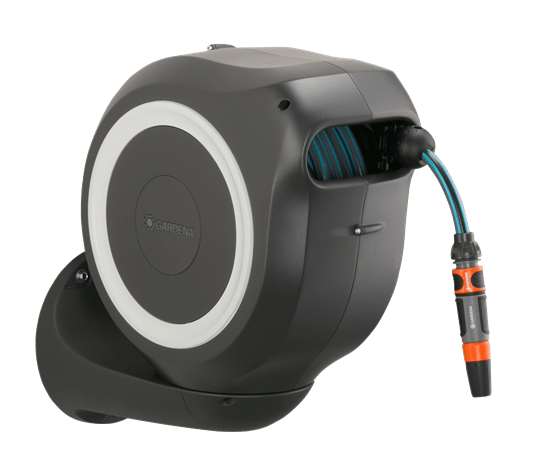 Leveres med et vægbeslag, en 20 meter 11mm vandslange, en tilslutningsslange, alle nødvendige originale GARDENA-systemdele samt en dyse med to forskellige sprayindstillinger.