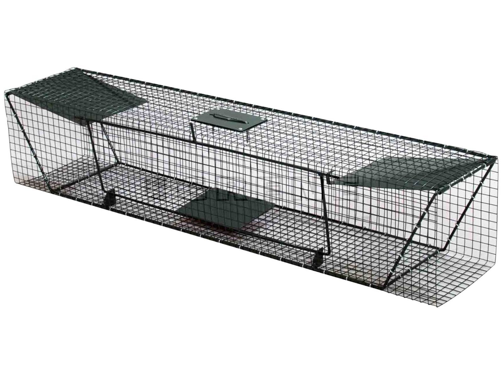 Trådfælde til mår og mink i kraftig udførelse Pulverlakeret i grøn RAL 6005, maskestørrelse 12,5 x 25 mm og tråddiameter 1,8 mm. Højde: 250 mm. Bredde: 250 mm. Længde: 1250 mm.
