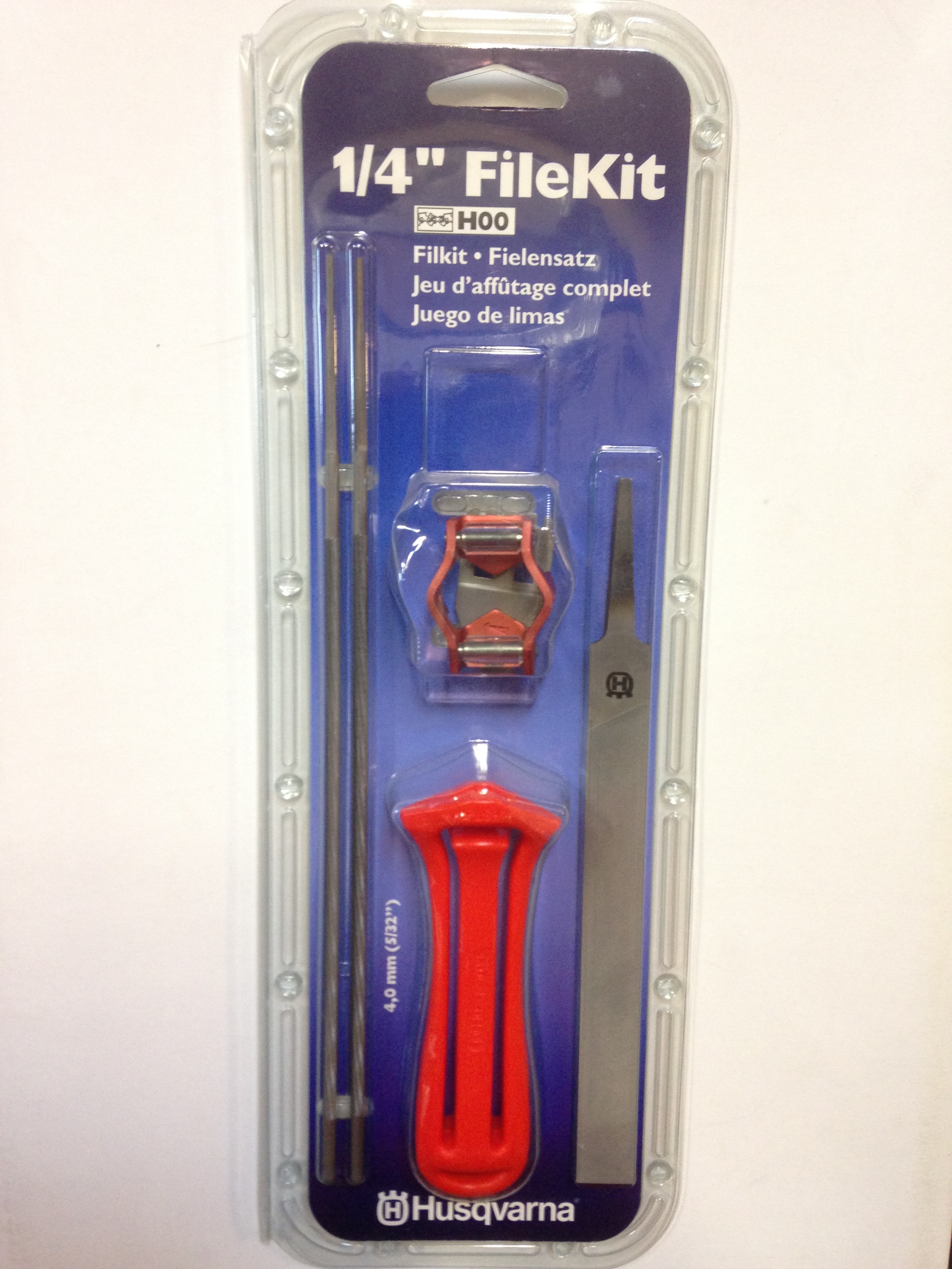 Komplet filesæt med filskaft, kombimål, 2 stk. rundfile og 1 stk. fladfil. Med kombimålet opnås den rigtige filevinkel og filehøjde på savtanden, og kombimålet gør det nemt at file rytteren i den rigtige højde. Passer til 1/4 H00 kæde, Oregon 25AP kæde, Stihl Picco Micro Mini 3 kæde