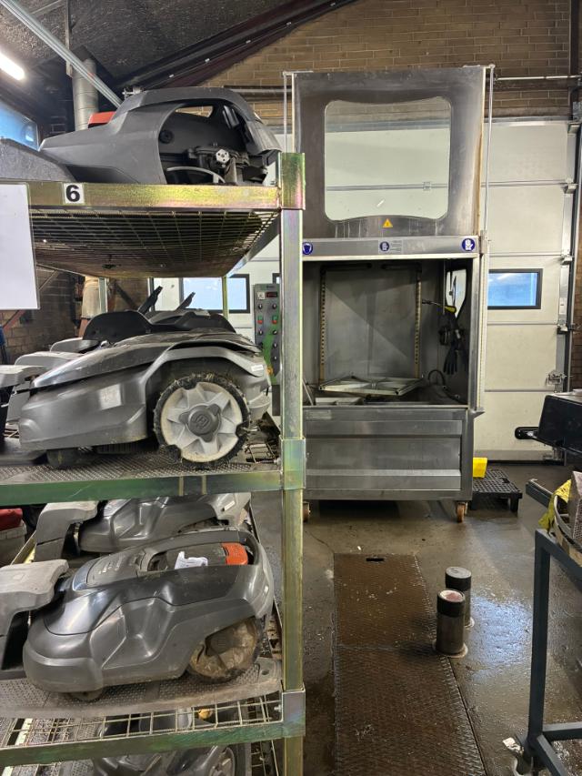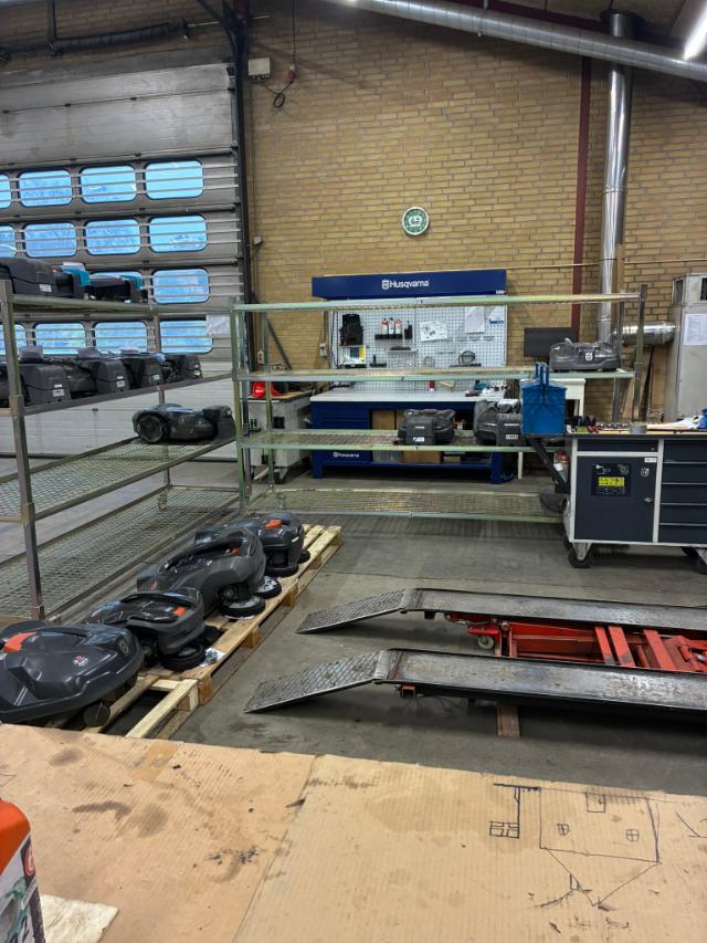 Vi tilbyder vinteropbevaring og servicering af Automower, hvilket indebærer eftersyn, montering af nye knive, opdatering og rengøring.