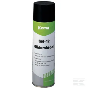 Glidemiddel fremstillet specielt til montage af elkabler og gummilister m.v. Montagen glider lettere og rivning af emnerne undgås. GM-12 fjerner friktion under samling af kloak-, fald- og trykrør af ABS- og PVC-plast og skåner samtidig pakninger m.v. GM-12 er også velegnet som vinyl make-up til biler. Påføres i et tyndt lag og efterpoleres med en tør klud. Egenskaber: 36% silicone - let montage af PVC-rør, el-kabler, gummilister m.v. - forhindrer rivning og fastsættelse af PVC og gummiemner - effektiv fra -50°C til +200°C - modvirker statisk elektricitet og korrosion - til bevægelige og stationære dele - klæbefri overflade - farveløs