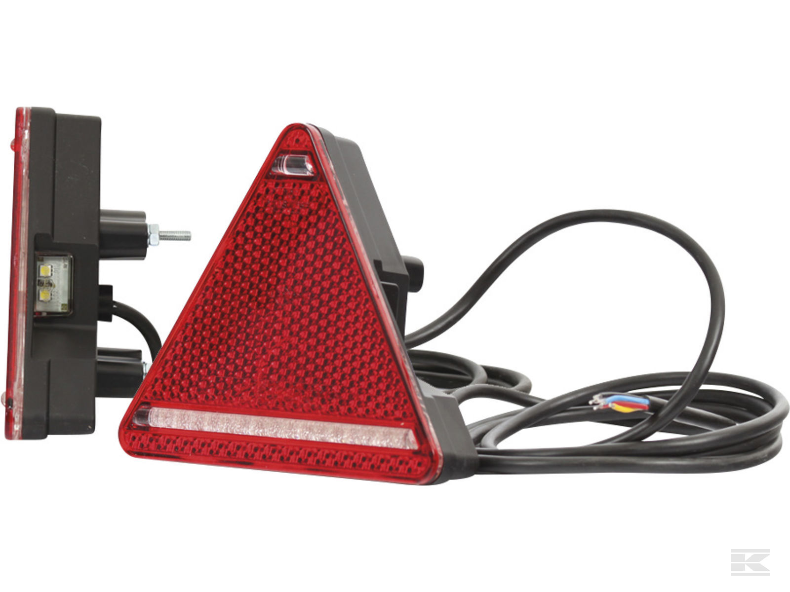LED baglygte med trekantrefleks, baglys, tågelys, baklys, blinklys, stoplys og nummerpladelys. Mål: bredde 163mm, højde 144mm, dybde 63,5mm. Ledningslængde 185cm