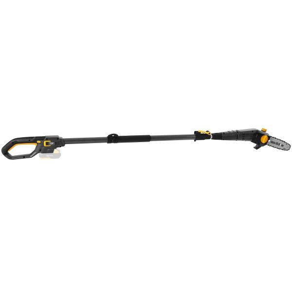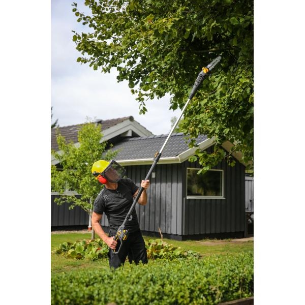 Stangkædesaven er udstyret med teleskopskaft, så totallængden kan ændres fra 192 cm til 259 cm - uden brug af værktøj. En stangsav er mere sikker at bruge end en almindelig kædesav, da det lange skaft giver en tryg afstand til området, hvor der skæres. Længden på beskæringssaven gør, at man med fødderne solidt plantet i jorden kan komme højt op og beskære grene - uden at skulle balancer på en stige eller lignende, og med en maskine på batteri får du bevægelsesfrihed, da du slipper for at bøvle med ledning - lige som du undgår larm fra en benzin motor. Sværdet er 8' (20 cm) og klarer grene op til tilsvarende diameter. Kædeolie påfyldes i tanken på skærehovedet. Der er automatisk kædesmøring, og en tilpas stor støtte (barksted) på undersiden af savhovedet sørger for, at man let kan holde saven fast mod den gren man skal save over. Batteri og lader købes særskilt.